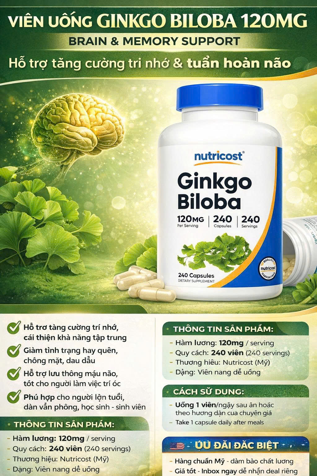 Sản phẩm chứa chiết xuất Ginkgo Biloba, một thành phần tự nhiên nổi tiếng trong việc hỗ trợ não bộ.
